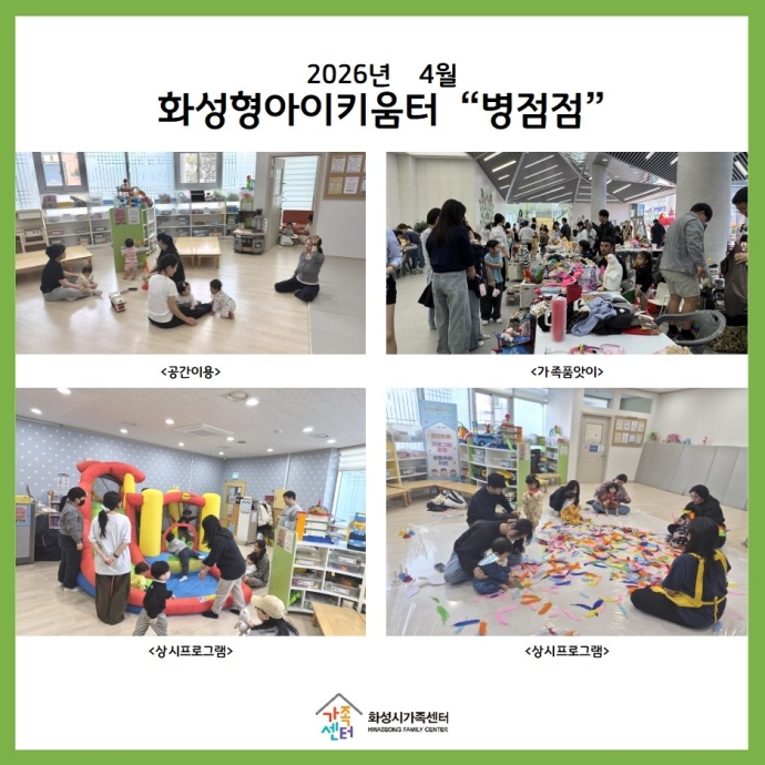 * »ç¾÷¸í : ȼºÇü¾ÆÀÌŰ¿òÅÍ(º´Á¡) 4¿ù »ç¾÷ * ÀÏ ½Ã : 2026³â 4¿ù ¿ù~±Ý (13:00~18:00) * Àå ¼Ò : ȼºÇü¾ÆÀÌŰ¿òÅÍ º´Á¡Á¡ * ´ë »ó : ȼºÇü¾ÆÀÌŰ¿òÅÍ È¸¿ø * ³» ¿ë : °ø°£ÀÌ¿ë, ÇÁ·Î±×·¥, °¡Á·Ç°¾ÑÀÌ, ¾Æºüǰ¾ÑÀÌ